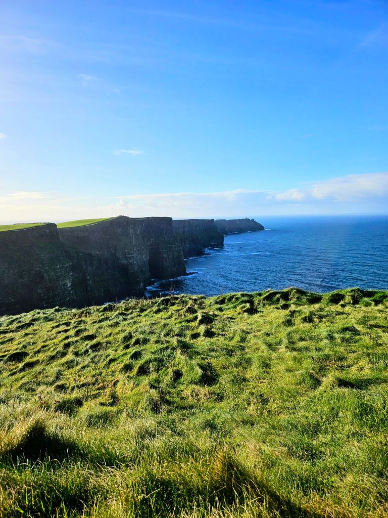The powerful gusts of wind, the seabirds gently hovering in the shadow of the Cliffs, the feeling of the lush grass, and clean air. The Cliffs of Moher are a site to behold. There were a lot of other people who were there to witness the Cliffs, but it was easy enough to find a spot away from the crowds to really appreciate them. There were cute, small shops that were built into the side of the hill next to the visitors center. The center itself had a cafe, information about the cliffs, and a small gift shop (I ended up buying some mead from there to share with my friends when I returned home). The Cliffs of Moher are a most see sight when visiting Ireland.
